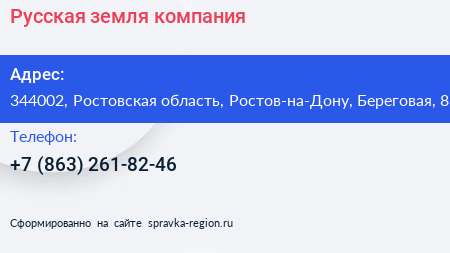 Русская земля, компания по адресу 344002, Ростовская область, Ростов-на-Дону, Береговая, 8 в дальнейшем Организация, размещена в следующих категориях: