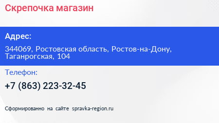 Для связи с организацией воспользуйтесь номером телефона: +7 (863) 223-32-45. Пн: c 09:00-19:00, Вт: c 09:00-19:00, Ср: c 09:00-19:00, Чт: c 09:00-19:00, Пт: c 09:00-19:00, Сб: c 09:00-19:00, Вс: c 10:00-18:00, вы можете обратиться в эту организацию.