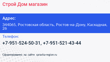 Строй Дом, магазин по адресу 344065, Ростовская область, Ростов-на-Дону, Каскадная, 26 в дальнейшем Организация, размещена в следующих категориях:
