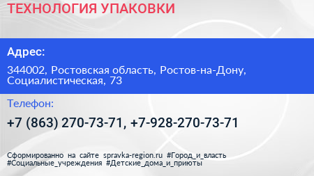 ТЕХНОЛОГИЯ УПАКОВКИ по адресу 344002, Ростовская область, Ростов-на-Дону, Социалистическая, 73 в дальнейшем Организация, размещена в следующих категориях:
