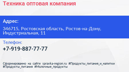 Техника, оптовая компания по адресу 346715, Ростовская область, Ростов-на-Дону, Индустриальная, 11 в дальнейшем Организация, размещена в следующих категориях:
