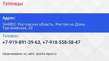 Теплицы по адресу 344002, Ростовская область, Ростов-на-Дону, Тургеневская, 22 в дальнейшем Организация, размещена в следующих категориях: