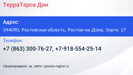ТерраТарса Дон по адресу 344090, Ростовская область, Ростов-на-Дону, Зорге, 17 в дальнейшем Организация, размещена в следующих категориях: