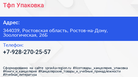 Тфп Упаковка по адресу 344039, Ростовская область, Ростов-на-Дону, Зоологическая, 26Б в дальнейшем Организация, размещена в следующих категориях: