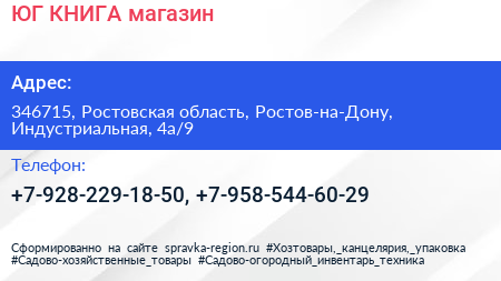 ЮГ КНИГА, магазин по адресу 346715, Ростовская область, Ростов-на-Дону, Индустриальная, 4а/9 в дальнейшем Организация, размещена в следующих категориях: