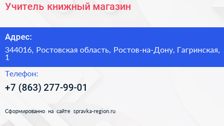 Учитель, книжный магазин по адресу 344016, Ростовская область, Ростов-на-Дону, Гагринская, 1 в дальнейшем Организация, размещена в следующих категориях: