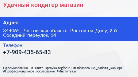 Удачный кондитер, магазин по адресу 344065, Ростовская область, Ростов-на-Дону, 2-й Соседний переулок, 14 в дальнейшем Организация, размещена в следующих категориях: