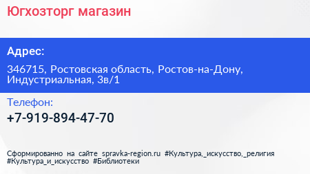 Югхозторг, магазин по адресу 346715, Ростовская область, Ростов-на-Дону, Индустриальная, 3в/1 в дальнейшем Организация, размещена в следующих категориях: