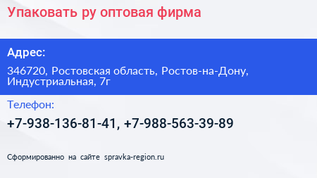 Упаковать.ру, оптовая фирма по адресу 346720, Ростовская область, Ростов-на-Дону, Индустриальная, 7г в дальнейшем Организация, размещена в следующих категориях: