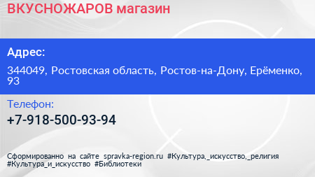 ВКУСНОЖАРОВ, магазин по адресу 344049, Ростовская область, Ростов-на-Дону, Ерёменко, 93 в дальнейшем Организация, размещена в следующих категориях: