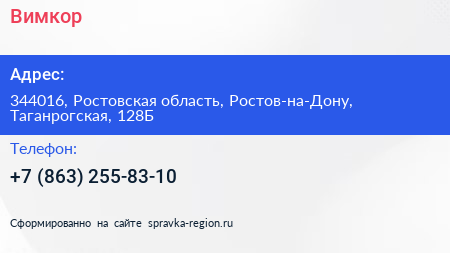 Вимкор по адресу 344016, Ростовская область, Ростов-на-Дону, Таганрогская, 128Б в дальнейшем Организация, размещена в следующих категориях: