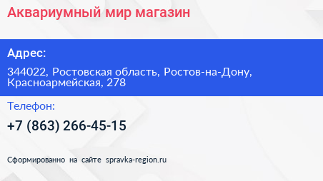 Аквариумный мир, магазин по адресу 344022, Ростовская область, Ростов-на-Дону, Красноармейская, 278 в дальнейшем Организация, размещена в следующих категориях: