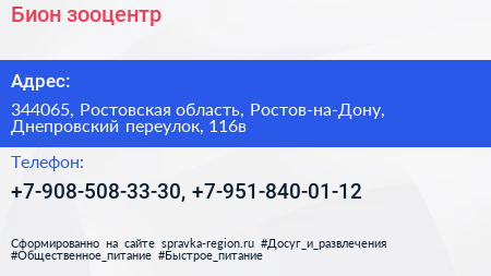 Бион, зооцентр по адресу 344065, Ростовская область, Ростов-на-Дону, Днепровский переулок, 116в в дальнейшем Организация, размещена в следующих категориях: