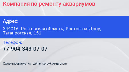Компания по ремонту аквариумов по адресу 344016, Ростовская область, Ростов-на-Дону, Таганрогская, 151 в дальнейшем Организация, размещена в следующих категориях: