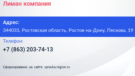 Лиман, компания по адресу 344033, Ростовская область, Ростов-на-Дону, Пескова, 19 в дальнейшем Организация, размещена в следующих категориях: