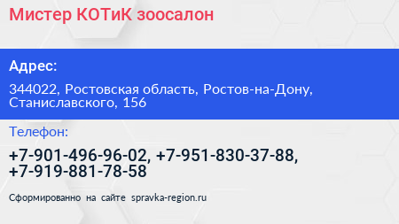 Мистер КОТиК, зоосалон по адресу 344022, Ростовская область, Ростов-на-Дону, Станиславского, 156 в дальнейшем Организация, размещена в следующих категориях: