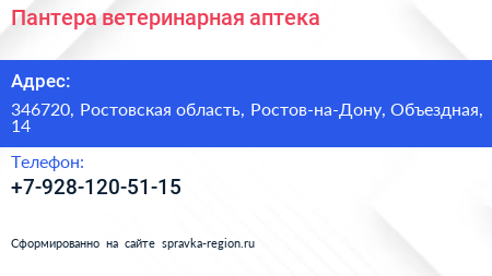 Пантера, ветеринарная аптека по адресу 346720, Ростовская область, Ростов-на-Дону, Объездная, 14 в дальнейшем Организация, размещена в следующих категориях: