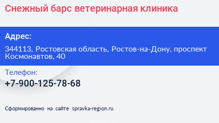 Снежный барс, ветеринарная клиника по адресу 344113, Ростовская область, Ростов-на-Дону, проспект Космонавтов, 40 в дальнейшем Организация, размещена в следующих категориях: