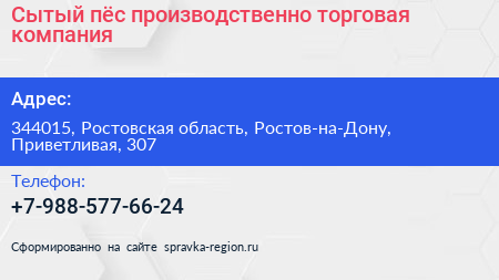 Сытый пёс, производственно-торговая компания по адресу 344015, Ростовская область, Ростов-на-Дону, Приветливая, 307 в дальнейшем Организация, размещена в следующих категориях: