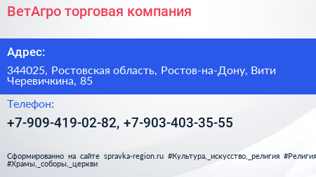 ВетАгро, торговая компания по адресу 344025, Ростовская область, Ростов-на-Дону, Вити Черевичкина, 85 в дальнейшем Организация, размещена в следующих категориях: