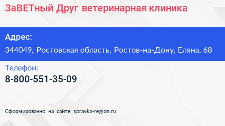 ЗаВЕТный Друг, ветеринарная клиника по адресу 344049, Ростовская область, Ростов-на-Дону, Еляна, 68 в дальнейшем Организация, размещена в следующих категориях: