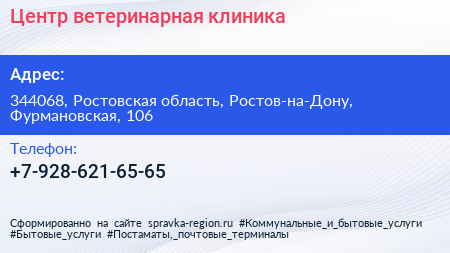 Центр, ветеринарная клиника по адресу 344068, Ростовская область, Ростов-на-Дону, Фурмановская, 106 в дальнейшем Организация, размещена в следующих категориях:
