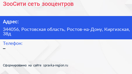 ЗооСити, сеть зооцентров по адресу 344056, Ростовская область, Ростов-на-Дону, Киргизская, 38д в дальнейшем Организация, размещена в следующих категориях: