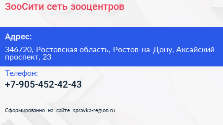 ЗооСити, сеть зооцентров по адресу 346720, Ростовская область, Ростов-на-Дону, Аксайский проспект, 23 в дальнейшем Организация, размещена в следующих категориях: