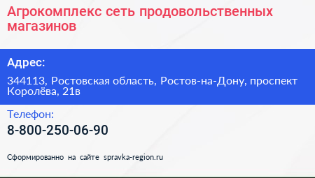 Агрокомплекс, сеть продовольственных магазинов по адресу 344113, Ростовская область, Ростов-на-Дону, проспект Королёва, 21в в дальнейшем Организация, размещена в следующих категориях: