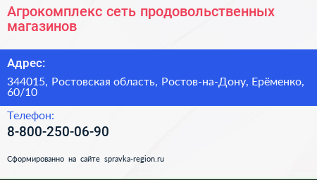 Агрокомплекс, сеть продовольственных магазинов по адресу 344015, Ростовская область, Ростов-на-Дону, Ерёменко, 60/10 в дальнейшем Организация, размещена в следующих категориях: