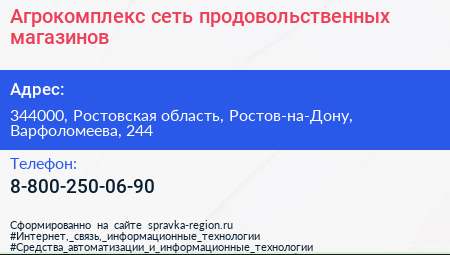Агрокомплекс, сеть продовольственных магазинов по адресу 344000, Ростовская область, Ростов-на-Дону, Варфоломеева, 244 в дальнейшем Организация, размещена в следующих категориях: