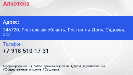 Алкотека по адресу 346720, Ростовская область, Ростов-на-Дону, Садовая, 31а в дальнейшем Организация, размещена в следующих категориях: