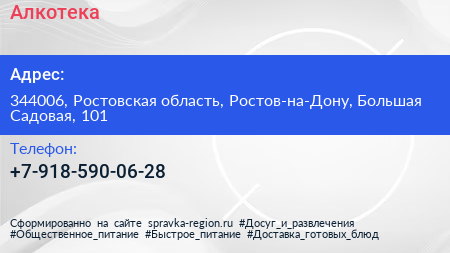 Алкотека по адресу 344006, Ростовская область, Ростов-на-Дону, Большая Садовая, 101 в дальнейшем Организация, размещена в следующих категориях: