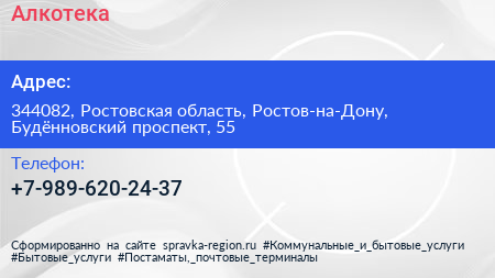 Алкотека по адресу 344082, Ростовская область, Ростов-на-Дону, Будённовский проспект, 55 в дальнейшем Организация, размещена в следующих категориях:
