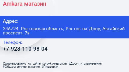 Amkara, магазин по адресу 346724, Ростовская область, Ростов-на-Дону, Аксайский проспект, 7а в дальнейшем Организация, размещена в следующих категориях: