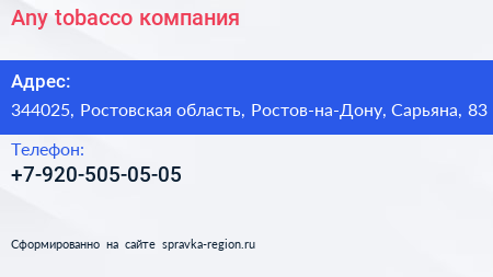 Any tobacco, компания по адресу 344025, Ростовская область, Ростов-на-Дону, Сарьяна, 83 в дальнейшем Организация, размещена в следующих категориях: