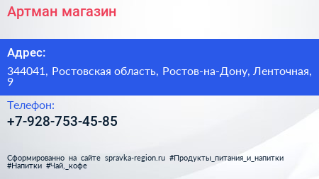 Артман, магазин по адресу 344041, Ростовская область, Ростов-на-Дону, Ленточная, 9 в дальнейшем Организация, размещена в следующих категориях: