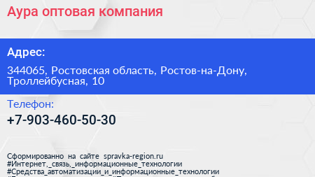 Аура, оптовая компания по адресу 344065, Ростовская область, Ростов-на-Дону, Троллейбусная, 10 в дальнейшем Организация, размещена в следующих категориях: