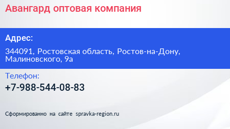 Авангард, оптовая компания по адресу 344091, Ростовская область, Ростов-на-Дону, Малиновского, 9а в дальнейшем Организация, размещена в следующих категориях: