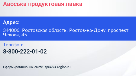 Авоська, продуктовая лавка по адресу 344006, Ростовская область, Ростов-на-Дону, проспект Чехова, 45 в дальнейшем Организация, размещена в следующих категориях: