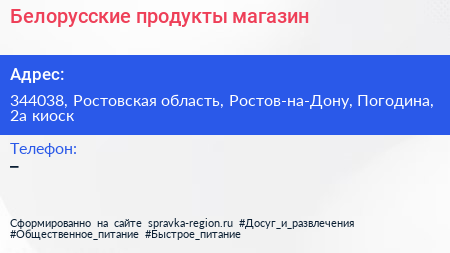 Белорусские продукты, магазин по адресу 344038, Ростовская область, Ростов-на-Дону, Погодина, 2а киоск в дальнейшем Организация, размещена в следующих категориях: