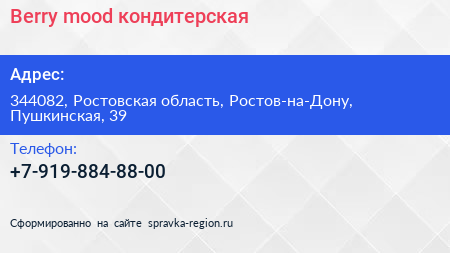 Berry mood, кондитерская по адресу 344082, Ростовская область, Ростов-на-Дону, Пушкинская, 39 в дальнейшем Организация, размещена в следующих категориях: