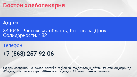 Бостон, хлебопекарня по адресу 344048, Ростовская область, Ростов-на-Дону, Солидарности, 182 в дальнейшем Организация, размещена в следующих категориях: