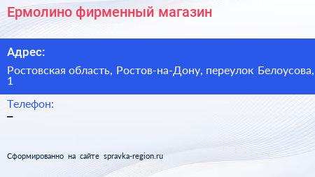 Ермолино, фирменный магазин по адресу Ростовская область, Ростов-на-Дону, переулок Белоусова, 1 в дальнейшем Организация, размещена в следующих категориях: