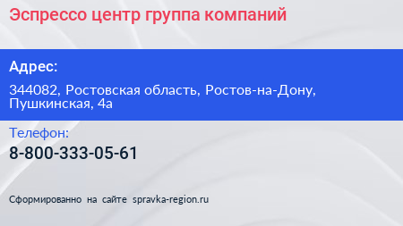 Эспрессо-центр, группа компаний по адресу 344082, Ростовская область, Ростов-на-Дону, Пушкинская, 4а в дальнейшем Организация, размещена в следующих категориях: