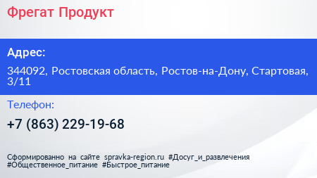 Фрегат-Продукт по адресу 344092, Ростовская область, Ростов-на-Дону, Стартовая, 3/11 в дальнейшем Организация, размещена в следующих категориях:
