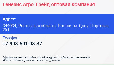 Генезис Агро Трейд, оптовая компания по адресу 344034, Ростовская область, Ростов-на-Дону, Портовая, 251 в дальнейшем Организация, размещена в следующих категориях: