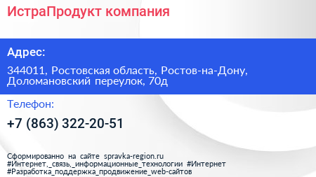ИстраПродукт, компания по адресу 344011, Ростовская область, Ростов-на-Дону, Доломановский переулок, 70д в дальнейшем Организация, размещена в следующих категориях: