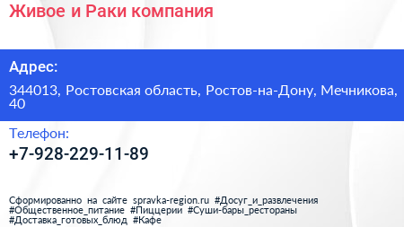 Живое и Раки, компания по адресу 344013, Ростовская область, Ростов-на-Дону, Мечникова, 40 в дальнейшем Организация, размещена в следующих категориях: