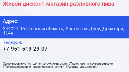 Живой дисконт, магазин разливного пива по адресу 344041, Ростовская область, Ростов-на-Дону, Доватора, 114а в дальнейшем Организация, размещена в следующих категориях: